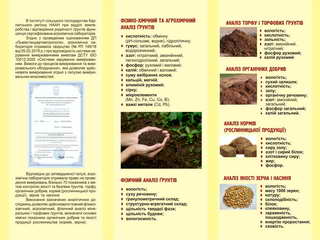- проводити повний фізико-хімічний, агрохімічний та фізичний аналіз мінеральних і торфових ґрунтів (вологість, гранулометричний склад, кислотність, азот, фосфор, калій, кальцій, магній, алюміній, сірка та ін.);